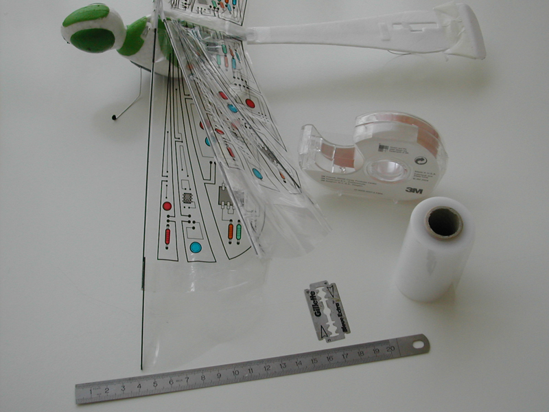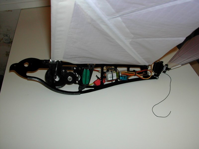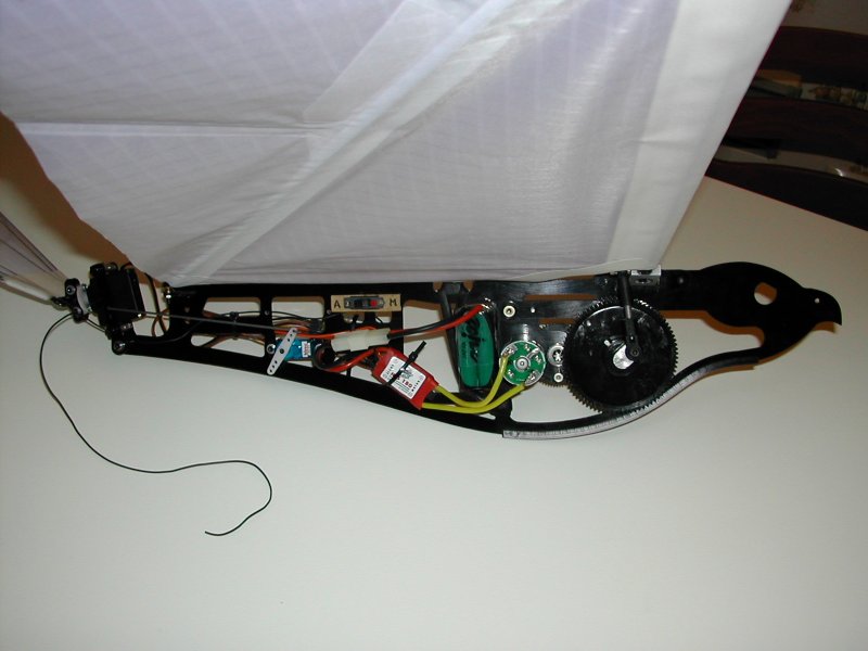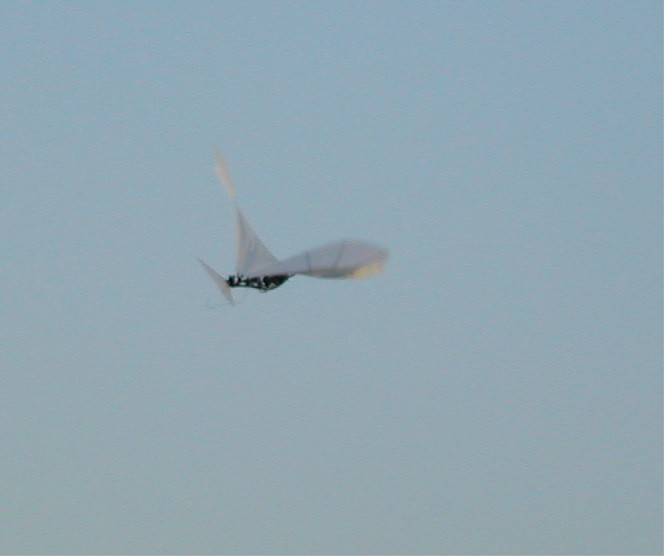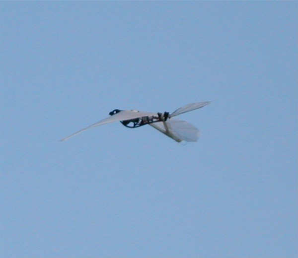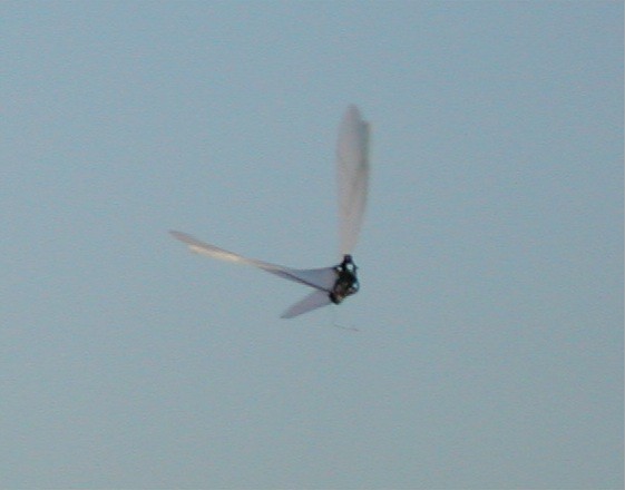 J'ai acheté cette libellule WowWee à Singapour avant qu'elle soit distribuée en France, mais on la trouve facilement maintenant: elle ne vole pas vite, mais a tendance à plonger dans les virages et ne remonte qu'en ligne droite et lentement par manque de puissance. Ce qui fait qu'elle vole difficilement dans un espace de 4mx5 (ma salle), elle est sûrement très bien en gymnase et dehors elle ne supporte que peu de vent. Mais elle est très résistante aux chocs (sauf attaque du chat, du chien ou de la savate de madame). On peut améliorer le vol avec un morceau de dépron à l'arrière, voir le forum US, mais ce n'est toujours pas impeccable. Dommage, dommage... mais j'ai finalement trouvé une solution décisive: agrandir chaque aile d'environ 4cm avec de la tige carbone 1mm, du film plastique et du scotch ruban, elle monte correctement maintenant, ne plonge plus dans les virages et le système électrique supporte bien la résistance supplémentaire des ailes. Le mieux, c'est de la faire voler la nuit: les deux leds vertes des yeux, le battement et le vol un peu erratique sont rigolos: video (6Mo) de nuit dans mon jardin. Fin 2007 sont aussi nés plusieurs jouets à aile battante, dont un ptérodactyle, voir le forum US, je ne peux plus citer tout ce qui sort, il s'en vend même à Carrefour, c'est dire... Par contre ça fait longtemps que de grands appareils ne sont pas apparus. Décembre 2009: un nouveau blog français sur l'orni http://lornito.blogspot.com Septembre 2010: Edwin de